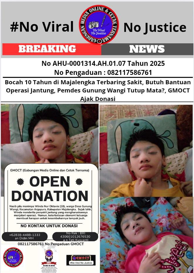 SotardugaNews.co.id – Majalengka, Jawa Barat ][ Nasib pilu menimpa Winda Nur Oktavia (10), warga Desa Gunung Wangi, Kecamatan Argapura, Kabupaten Majalengka. Sejak lahir, Winda menderita penyakit jantung yang mengharuskannya menjalani operasi. Namun, keterbatasan ekonomi keluarga membuat harapan untuk kesembuhannya tampak jauh.