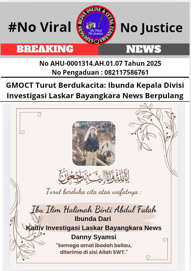 SotardugaNews.co.id, Bandung ][ 26 Mei 2025 (GMOCT) – Keluarga Besar Laskar Bayangkara News, Jurnal Bayangkara News, dan Gabungan Media Online dan Cetak Ternama (GMOCT) berduka cita atas berpulangnya Ibu Ilim Halimah Binti Abdul Falah. Almarhumah merupakan ibunda tercinta dari Bapak Danny Syamsi, Kepala Divisi Investigasi Laskar Bayangkara News. Ibu Ilim Halimah meninggal dunia pada Minggu, 25 Mei 2025.