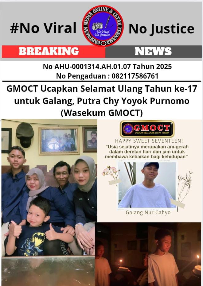 SotardugaNews.co.id – Pati Jawa Tengah (GMOCT) – Gabungan Media Online dan Cetak Ternama (GMOCT) turut merayakan hari bahagia keluarga Chy Yoyok Purnomo (Pimpinan Redaksi Centralpers.press dan Wakil Sekretaris Umum GMOCT) dan Suharni. Putra mereka, Galang Nur Cahyo, baru saja menginjak usia 17 tahun pada tanggal 25 Mei 2025. Ketua Umum GMOCT, Agung Sulistio, dan Sekretaris Umum, Asep NS, mewakili seluruh jajaran pengurus dan anggota GMOCT menyampaikan ucapan selamat ulang tahun.