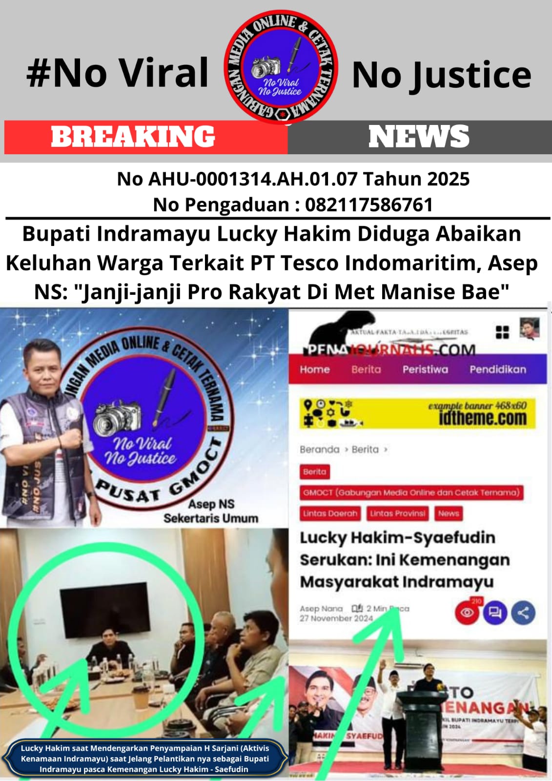 Asep NS selaku Sekertaris Umum GMOCT Gabungan Media Online dan Cetak Ternama yang juga Pemred Media Online Penajournalis.com yang pernah ikut menanyangkan pemberitaan kemenangan Lucky Hakim – Saefudin