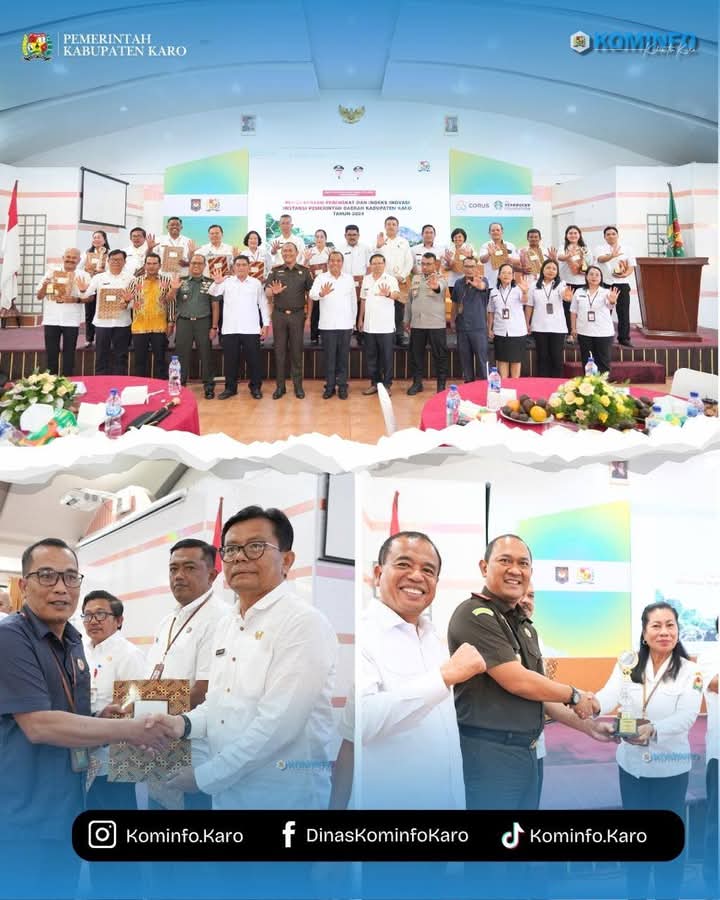 Selain itu, dalam rangka mendorong reformasi birokrasi dan budaya kerja inovatif, Bupati juga menyerahkan Penghargaan Peringkat dan Indeks Inovasi Instansi Pemerintah Daerah Kabupaten Karo Tahun 2024. Penghargaan ini diberikan kepada organisasi perangkat daerah (OPD) yang dinilai berhasil menghadirkan pelayanan publik yang efektif, efisien, dan berbasis solusi inovatif.