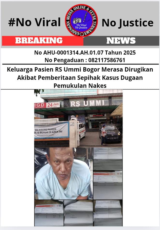 PublikBicaraNews.id, Bogor (GMOCT) – Keluarga pasien Rumah Sakit Ummi Bogor merasa dirugikan oleh pemberitaan sepihak terkait dugaan pemukulan tenaga kesehatan (nakes). Kejadian bermula saat pasien stroke dibawa ke UGD, namun ditolak dengan alasan kamar penuh, meskipun keluarga pasien siap membayar biaya pengobatan secara umum.
