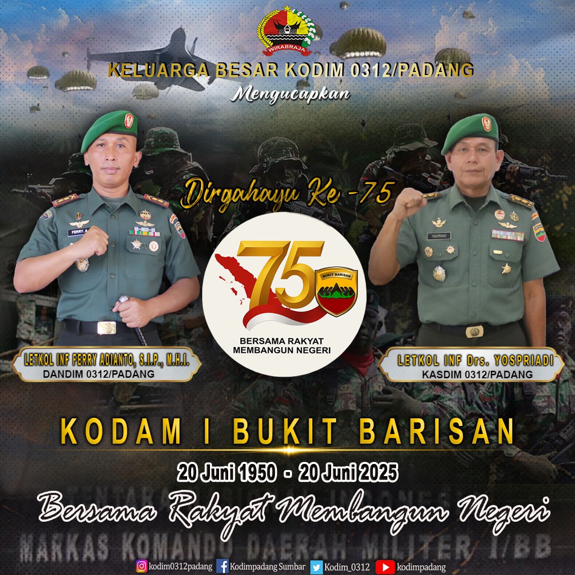 Segenap Keluarga Besar Kodim 0312/PDG mengucapkan selamat Dirgahayu Hut ke – 75 Tahun Kodam 1/BB. Salah satunya disampaikan Dandim 0312/PDG, Letkol Inf Ferry Adianto.,S.I.P.,M.H.I.
