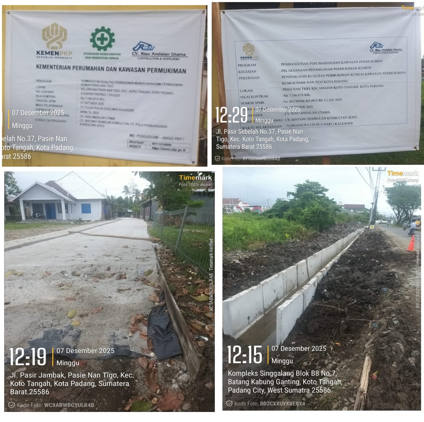 Kota Padang – PublikBicaraNews.id, Sumbar | Proyek peningkatan kualitas permukiman kumuh di Kelurahan Pasie Nan Tigo, Kecamatan Koto Tangah, Kota Padang, yang dibiayai negara melalui anggaran Rp 7.546.874.400, kini menuai sorotan setelah investigasi lapangan menemukan berbagai dugaan ketidaksesuaian pekerjaan.