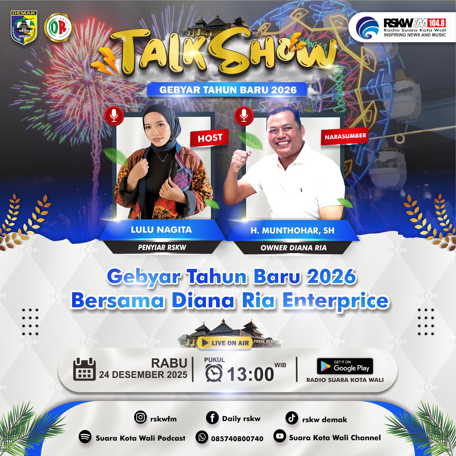 PublikBicaraNews.id, DEMAK ][ Radio Suara Kota Wali (RSKW) FM 104.8 akan menggelar talk show spesial menyambut Gebyar Tahun Baru 2026 bersama Diana Ria Enterprice. Acara ini akan disiarkan langsung pada: