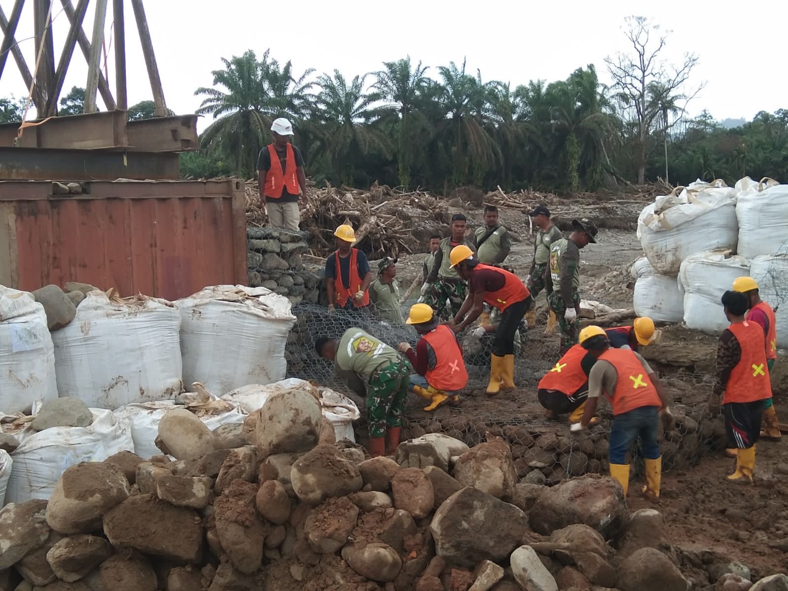 Pada tahap awal, rangkaian kegiatan difokuskan pada penyiapan material abutmen di sisi tepi dekat sungai serta perakitan kawat mal bronjong sebagai penguatan konstruksi. Meski sempat terkendala kondisi cuaca hujan, pekerjaan tetap berjalan dan menunjukkan perkembangan signifikan.