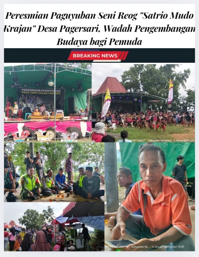 PublikBicaraNews.id – BERGAS, KABUPATEN SEMARANG (4 Januari 2026) – Paguyuban Seni Reog bernama “Satrio Mudo Krajan” resmi diperesmikan pada Minggu (4/1) di Lapangan Jogo Semi Desa Pagersari, Kecamatan Bergas, Kabupaten Semarang, Jawa Tengah. Acara yang dihadiri oleh berbagai unsur terkait ini bertujuan untuk melestarikan dan mengembangkan seni Reog sebagai warisan budaya lokal sekaligus menjadi wadah positif bagi aktivitas pemuda.