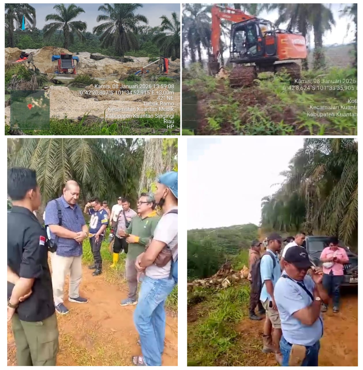 Ekon menjelaskan bahwa aktivitas tersebut diduga terjadi pada area seluas ±94 hektare yang berbatasan langsung dengan HGU eks Duta Palma yang kini dikelola oleh PT Agrinas Palma Nusantara (APN) di Desa Koto Cengar, Kecamatan Kuantan Mudik. Dugaan tersebut diperkuat dengan dokumentasi video yang memperlihatkan alat berat melakukan aktivitas penumbangan (chipping) batang kelapa sawit, serta keberadaan sejumlah rakit PETI di lokasi.