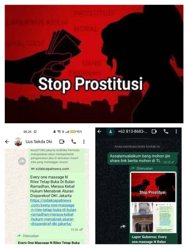 Every one massage N Rilex yang berada di ruko rich palace Meruya Ilir Raya blok B 19 RT 08 RW 07 Kel Srengseng kec kembangan Jakarta Barat masih tetap bandel membuka usahanya prostitusi terselubung berkedok massage sampai hari Minggu 1 Maret 2026, karena merasa kebal hukum dan berani menabrak aturan Disparekraf DKI Jakarta di duga dilindungi S oknum pejabat Parenkraf Jakbar. Dengan bukti diblokirnya nomor WhatsApp Tim media hingga terkesan pejabat Parenkraf Jakarta Barat yang sangat arogan, anti kritik dan anti media, wibawa dan integritas Disparekraf DKI Jakarta di pertaruhkan. Link berita yang sudah naik juga sudah di share ke sekda DKI Jakarta Uus Kuswanto agar dapat menjadi perhatian khusus Pemda DKI Jakarta hingga berita ini di tayangkan belum ada konfirmasi apalagi tindaklanjut dari Pemda DKI Jakarta melalui Disparekraf DKI Jakarta.
